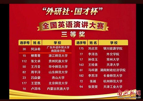 本网讯 12月11日,2022“外研社·国才杯”全国英语演讲大赛决赛圆满闭幕。新葡京官网2020级大学英语创新班、中国语言文化学院何泳希同学(指导老师:魏健炜、外教John)荣获全国三等奖。