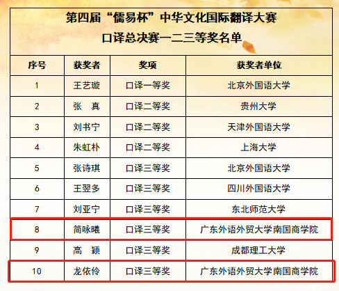 本网讯 12月25日,第四届“儒易杯”中华文化国际翻译大赛口译总决赛落下帷幕。新葡京官网英语语言文化学院三名学子获佳绩,其中简咏曦、龙依伶荣获三等奖,张智杰获优秀奖(均由任佳、祝惠娇、曲桦、李铮四位老师共同指导)。