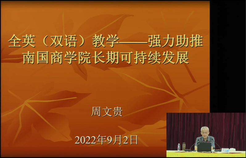 周文贵教授用“一招鲜,吃遍天”形象的概括出全英(双语)教学品牌在新葡的京集团35222vip创建和发展中的重要地位。他表示“特色”是学校长期可持续发展的原动力,“外语特色”就是南国的底气。针对英语学习的难点,他分享了破“尬”之钥,即通过不间断的教学改革,采取切实可行的措施,促进英语学习和专业教学的全面融合,推动英语学习由低层级目标向高层级目标提升,借此升华南国鲜明的外语特色。周教授分享了南国在全英(双语)教学方面的四大举措:一是思想上高度重视;二是组织上形成体系;三是精心设定科学的课程结构和教学计划;四是强调专业教学和英语教学的有机融合。他从双语教学过程、课程适用和教师选择三个方面提出原则性建议,并对学校发展的再谋划和特色构建提出了新的见解。周教授的专题讲座对正在承担全英双语教学任务的教师带来新的启发和感悟,对推进学校双语教学工作的深入开展发挥了积极作用。