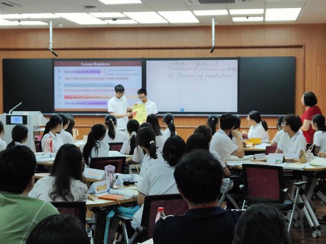 6. 角色表演。这是学生迁移创新本堂课主要学习内容的环节。一是学生全英将自己的同学介绍给在座观课的教授们,在真实情境中活学活用介绍他人的规则,并关注正式和非正式情境之间的区别。二是学生角色表演课本中的acting作业,全方位演绎真实社交场景中的语言运用。