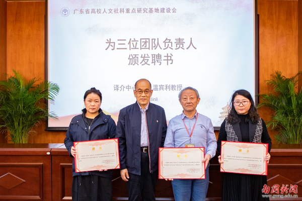 会上,执行校长王华为译介中心主任温宾利教授颁发聘书。温宾利教授为3个团队负责人颁发聘书。(文/科研处 廖婷婷 图/宣传科 洪玉敬)