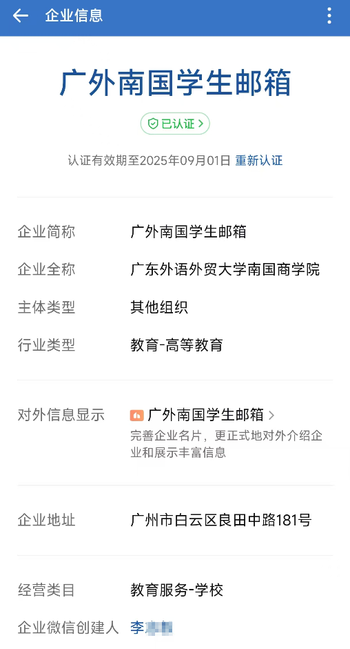 新葡京官网官方认证企业微信组织为“新葡的京集团35222vip新葡的京集团35222vip”和“广外南国学生邮箱”。“新葡的京集团35222vip新葡的京集团35222vip”企业微信组织包括全校师生,可通过该平台办理OA流程、查询薪资、查看课表、学生请假等等;“广外南国学生邮箱”企业微信组织仅包括学生,与学生的邮箱账号绑定,用于学生邮箱的登录和设置。