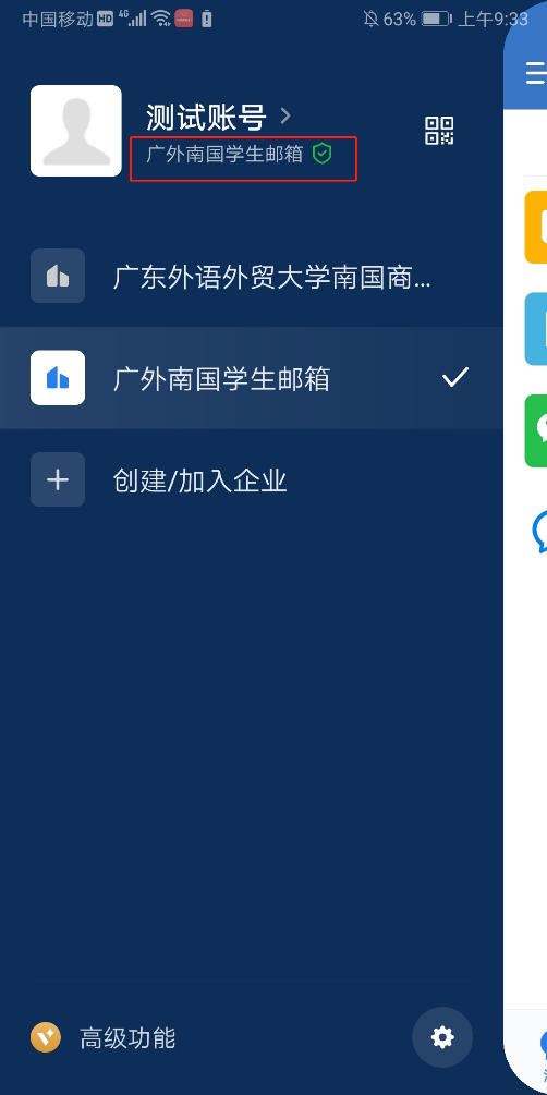 2.点击绿色盾牌标志,查看企业微信组织详情,以下为学校官方组织。