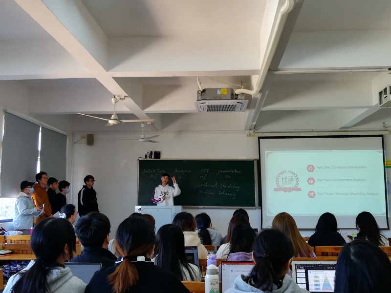 观摩课上,共有三组学生展示了他们的学习研究成果。三组学生分别汇报了他们对朴朴超市、美团和麦当劳三家企业的市场营销策略研究。学生们全程使用英语进行展示,数据充实,分析详细,PPT精美、重点突出,表达流畅、清晰。尤其是李欣怡、蔡燕玲等同学,能够以近乎脱稿的方式演讲,展现出很好的英语口语表达能力和语言素养。