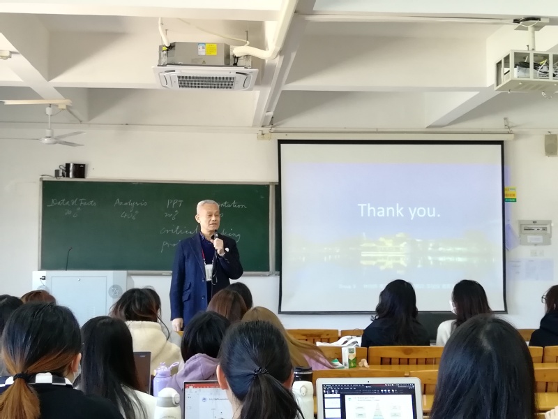 课后,周文贵教授高度肯定和赞扬了三组同学的表现。他表示,英语作为目前世界上使用范围最广的语言,在信息、商业、生活中的应用占据很大比例。遗憾的是,中国目前仅有小部分人能用英语进行交流,更不能就专业的问题进行分析、讨论。从三组同学的表现来看,实属难能可贵,只是还没有达到面对面交流,自由表达自己的观点的程度。总的来说,未来可期。