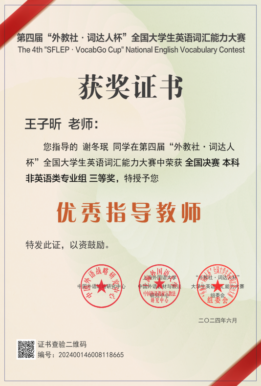 近日,第四届“外教社·词达人杯”全国大学生英语词汇能力大赛国赛圆满落下帷幕。新葡京官网2023级国际经济与贸易(专升本)的谢冬珉同学(经济学院)荣获国赛三等奖(指导老师:王子昕)。