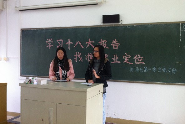 本网讯 12月5日,英语系第一学生党支部在A402召开关于“学习十八大报告,找准就业定位”的民主生活会讨论会,新一期入党发展对象参加了此次会议。