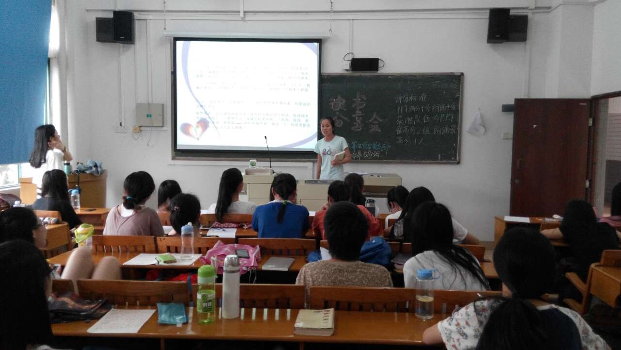 本网讯 为响应世界读书日的号召,倡导同学们养成“好读书,读好书”的良好习惯,英文学院红棉读书社开展了以“我读书,我快乐”为主题的读书分享会。4月21号下午,英文学院第三党支部举办了读书分享会的初赛。此次初赛共有八支队伍参加,各组分别挑选一名队员作为评委。参赛队员们介绍的书籍涉猎范围广,有文学大家钱钟书的《围城》,俄国作家托夫妥耶夫斯基的《罪与罚》,娱乐与冒险于一身的摄影师王基德的《追星81天》等。队员们都以ppt的形式向同学们详细的介绍了他们推荐的书籍,并就其中的精彩片段进行了朗诵且分享了她们的读后感。