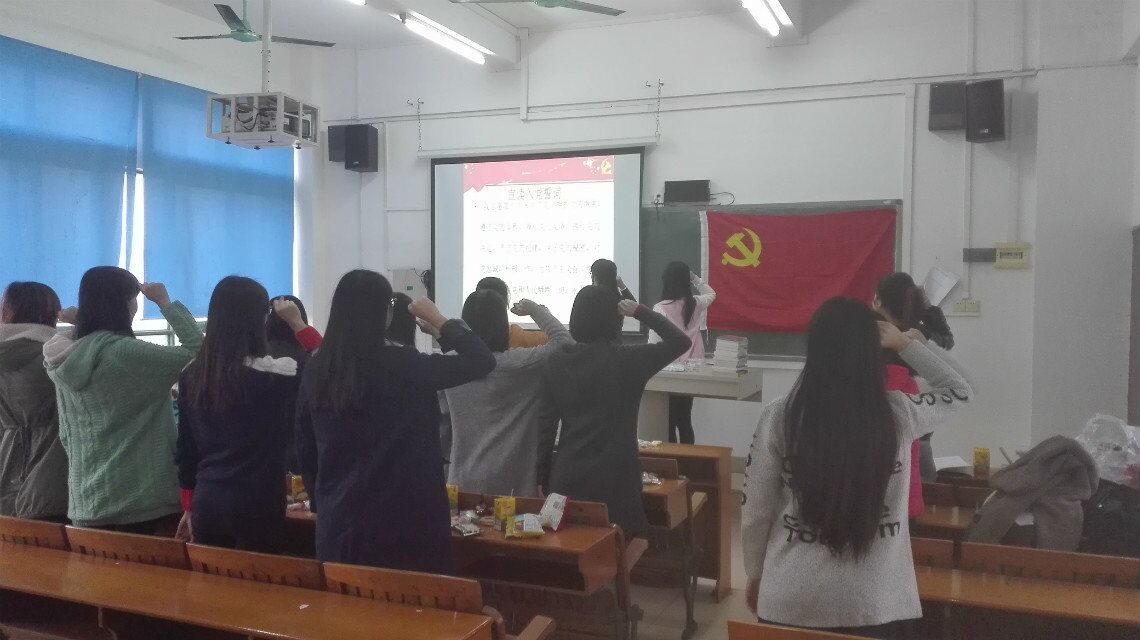 本次活动主要分为“唱国歌、宣党誓、谈感悟”、“玩游戏、颁奖礼、抽奖励”以及大合照三大环节。活动开始,在主持人孙志明、陆敏静的带领下,支部与会全体成员起立演唱国歌、宣读入党誓词。随后,在书记徐燕萍老师的带领下,我们回顾了过去三年多以来支部举办过的各种活动,例如党旗入宿舍、给环卫工人送军鞋、广东省博物馆之行等等;此外,徐老师还点评了各届支部委员以及支部成员对支部发展作出的贡献,例如前副书记罗雅之同志劳心劳力在徐老师休假期间带领大家取得先进党支部等荣誉称号;现任副书记吕卓儒同志尽心尽责协助入党积极分子、发展对象预备党员们完成入党流程,为支部默默付出;潘伟江同志尽心完善支部规章制度,帮助新加入支部的入党积极分子备战党课考试;陈可欣同志带领支部同志参加红色微电影活动为支部添光加彩等等。最后,支部对同志们的付出与努力进行了认可并颁发了奖品以资鼓励。